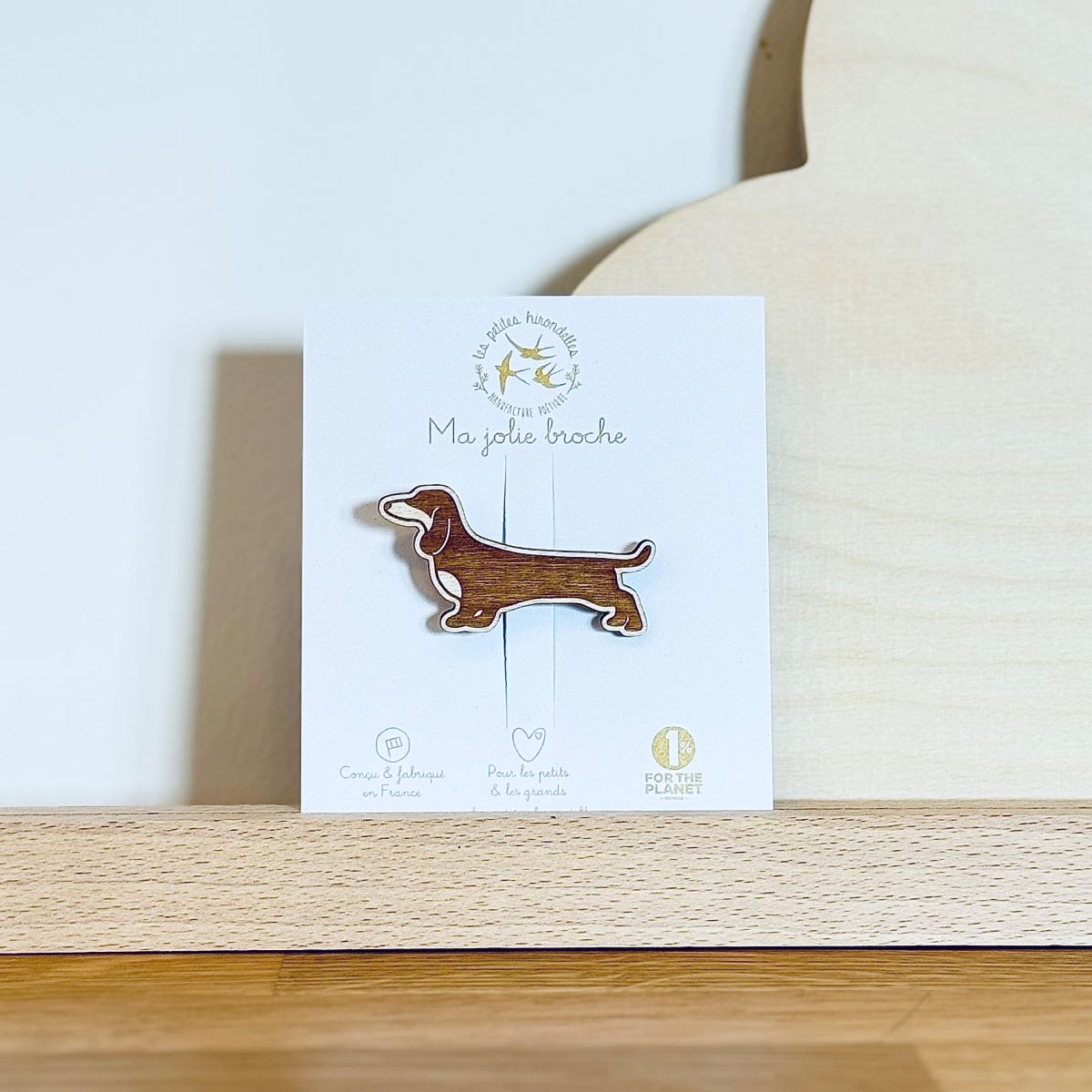 Cette broche teckel est en bois, avec une attache métallique. Elle a été dessinée et fabriquée dans notre atelier près d’Annecy, en France.