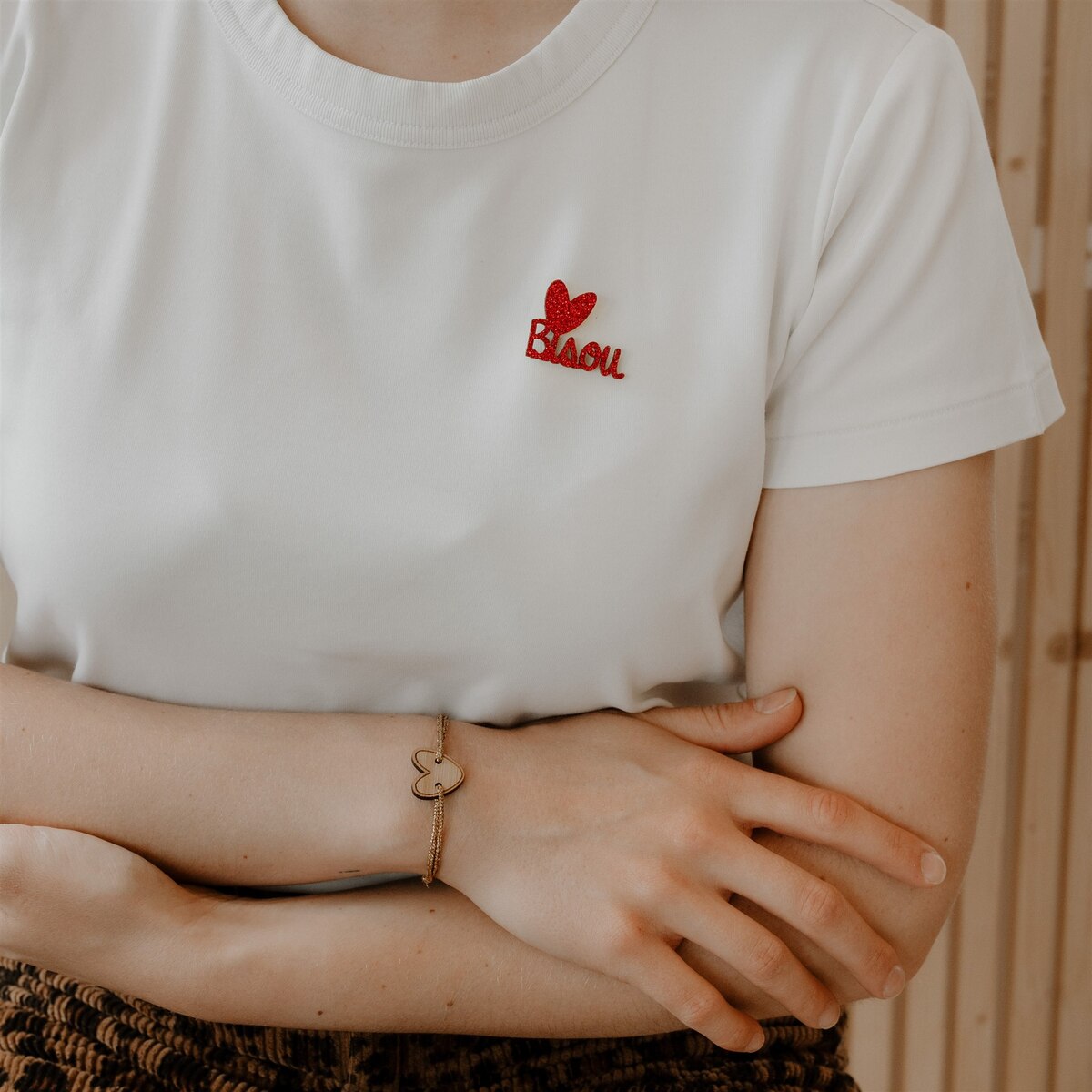 Une petite broche pailletée Bisou pour transmettre un peu d’amour. Ce pin’s existe en doré, argenté, rouge et multicolore.
