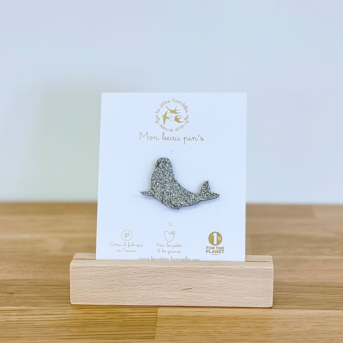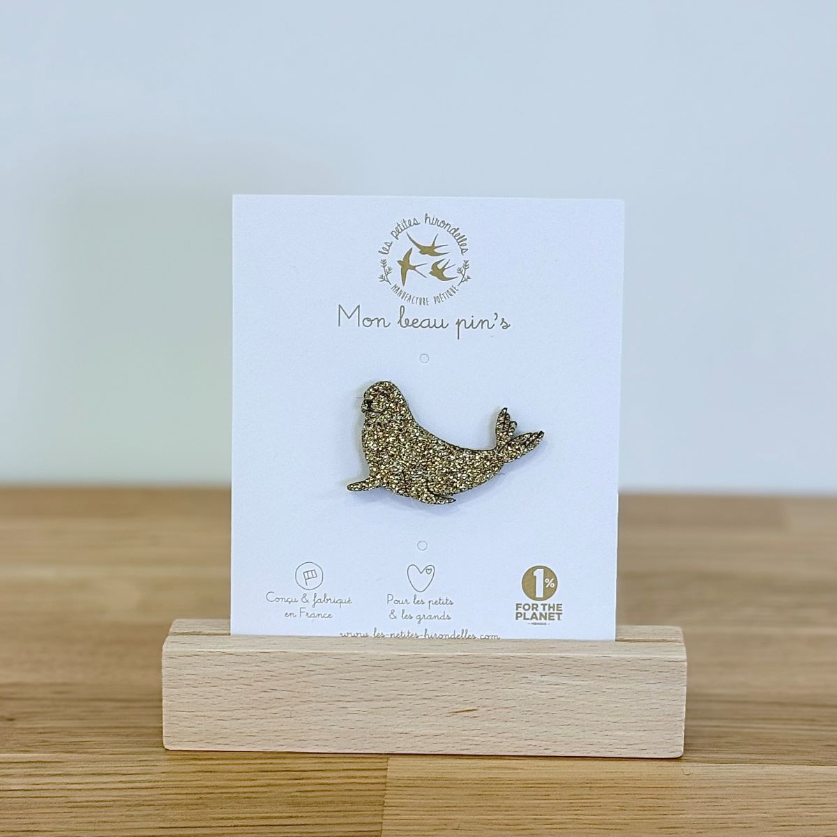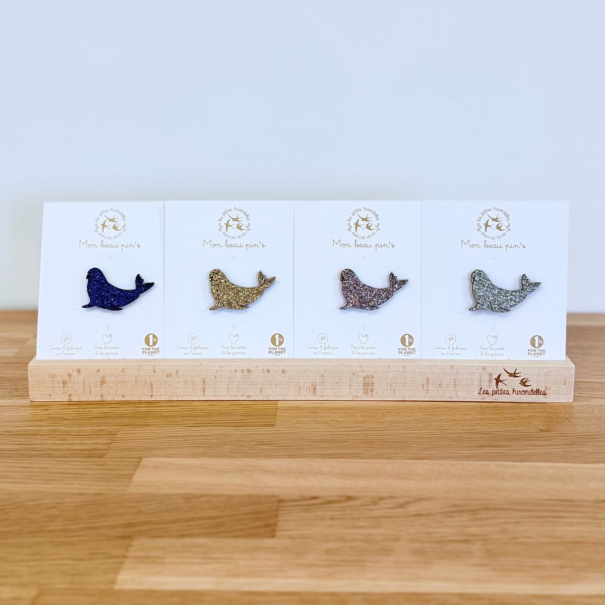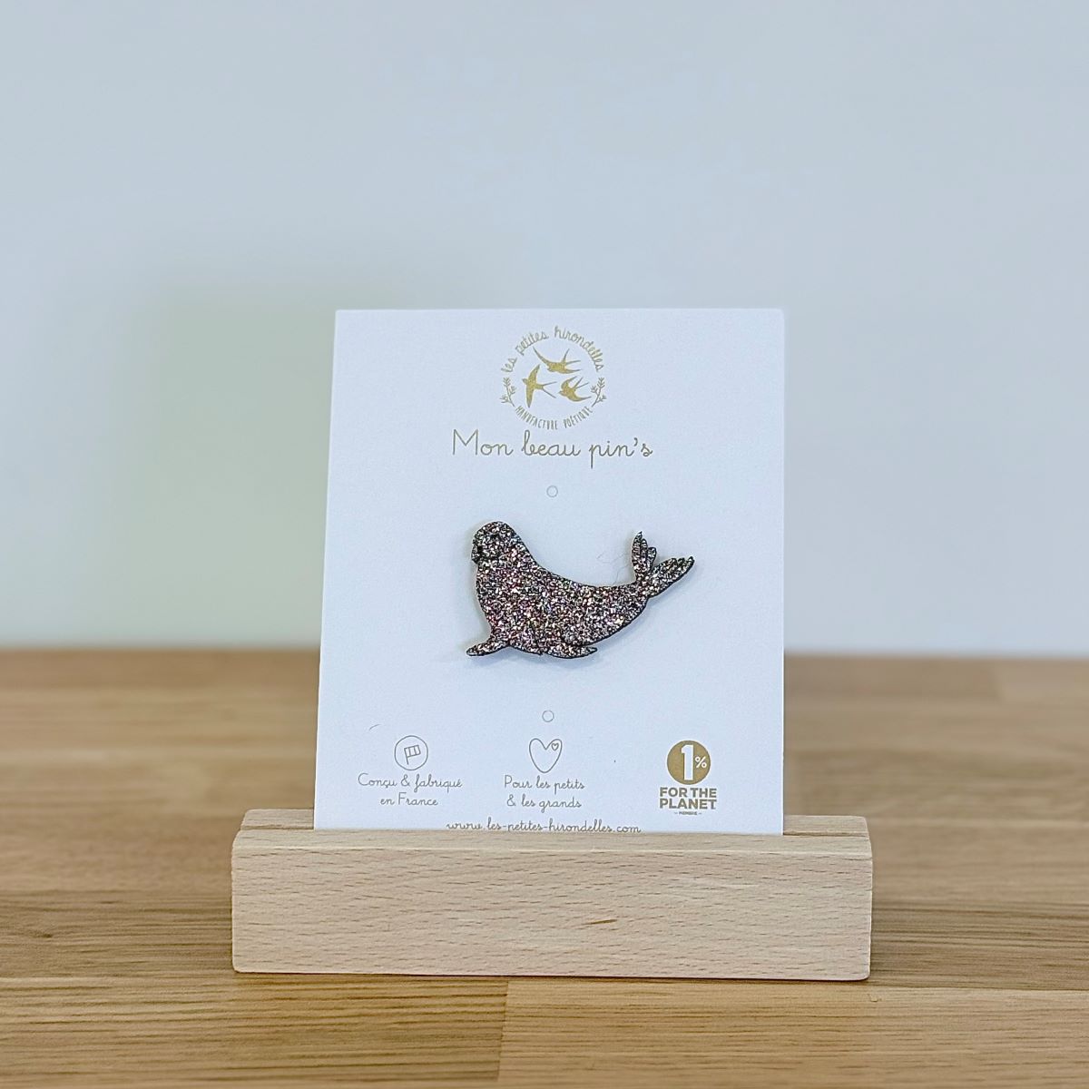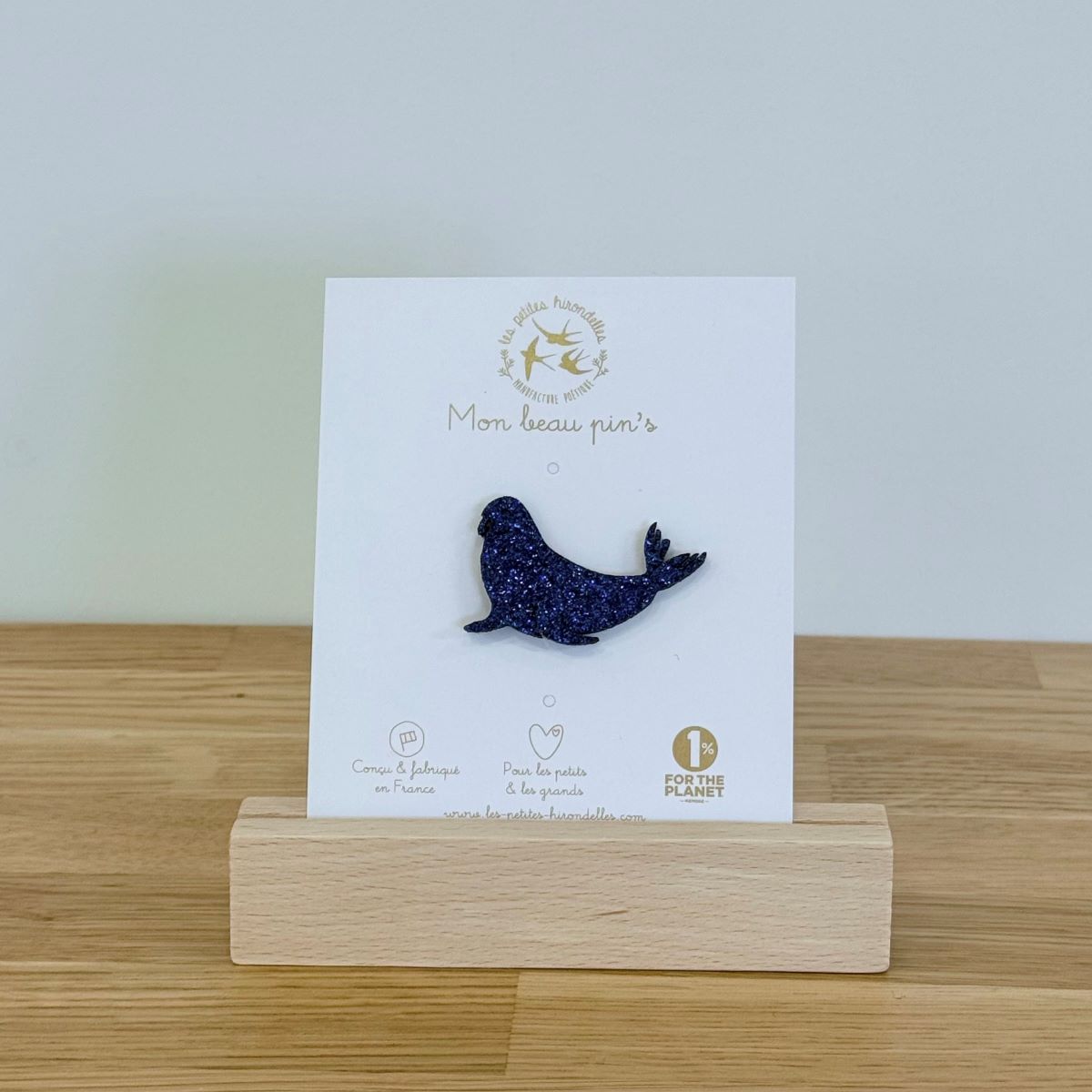Ce pin’s phoque est en feutrine et paillettes, avec une attache métallique. Il a été dessiné et fabriqué dans notre atelier près d’Annecy, en France.