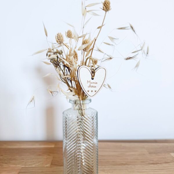 Pic Botanique avec tige en métal et élément en bois de bouleau en forme de lettre avec écriture "tu vas bientôt être mamie" dans un vase