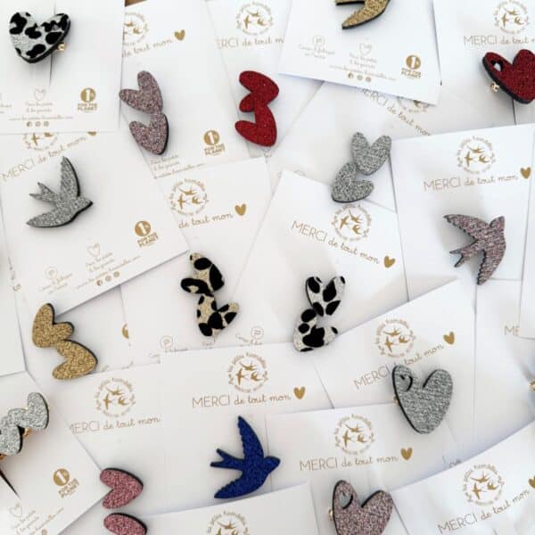 Explore notre collection de broches et pin’s en feutrine pailletée, laiton ou bois.